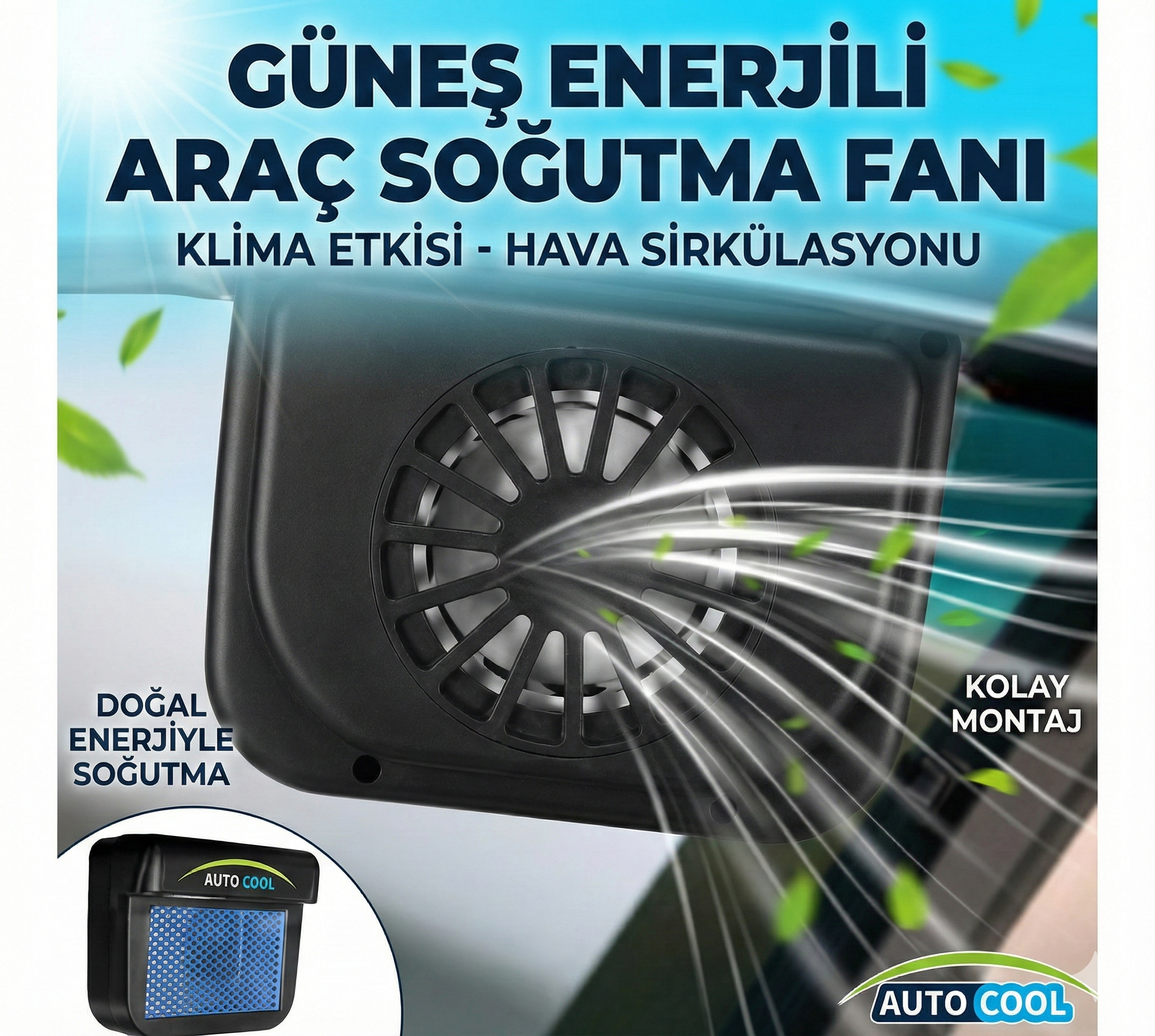 Auto Cool araç içerisindeki sıcak havayı dışarı aktarır ve havayı temizler.Yazın kavurucu sıcağında arabaya binmek bu muhteşem ürünle işkence olmaktan çıkıyor.Hiçbir kablo yada pile ihtiyaç duymadan Auto Cool sadece güneş enerjisi ile çalışmaktadır.