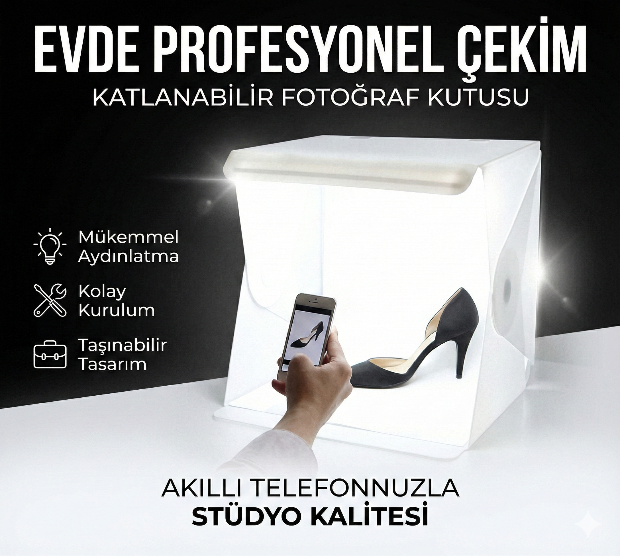 Beyaz led ışıklı ürün çekim çadırı ile çok kısa bir sürede fotoğraf çekimleri için mükemmel bir zemin oluşturabilirsiniz. Fotoğraf meraklısı, sanatçı, online ürün satıcı, profesyonel fotoğrafçı ve ürün reklamı yapan kişi ve firmalar için tasarlanmış özel bir üründür.