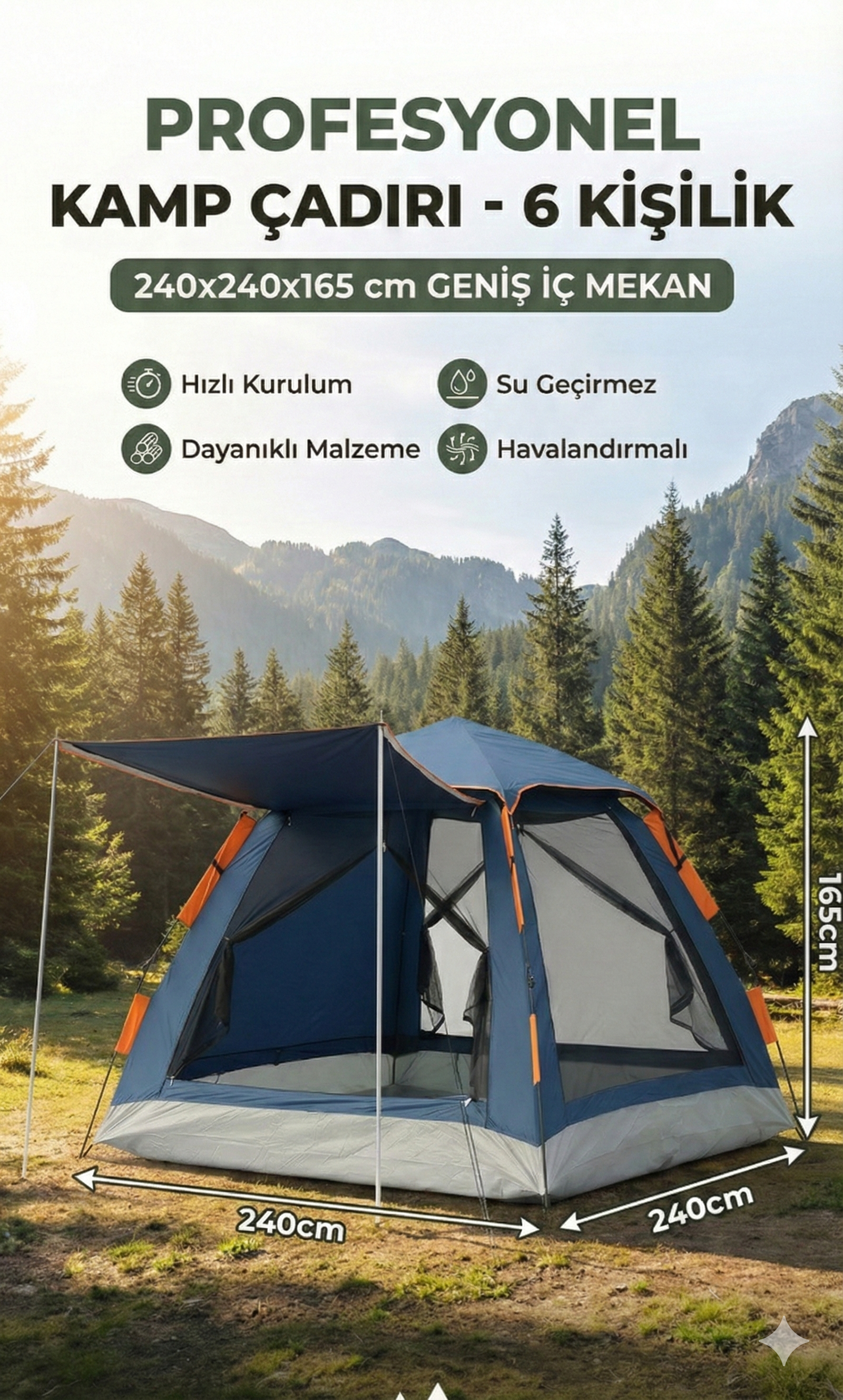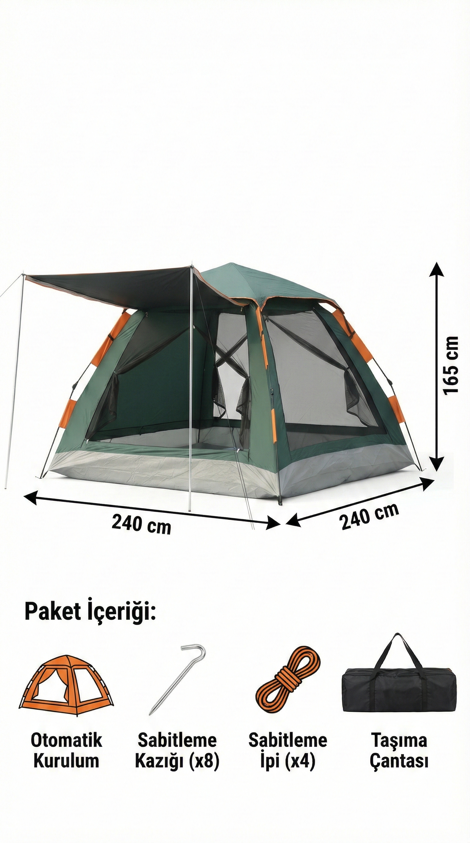 Tam Otomatik Su Ve Rüzgar Geçirmez Gölgelikli Tenteli 6 Kişilik Kamp Çadırı 240*240*155cm