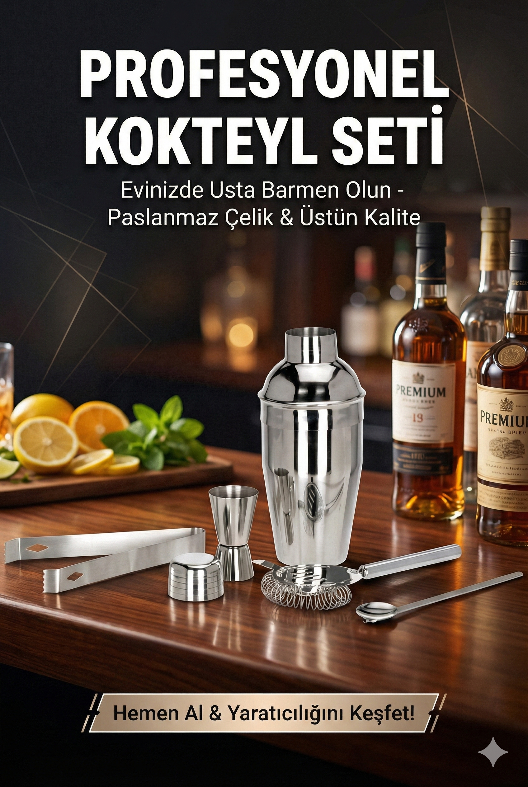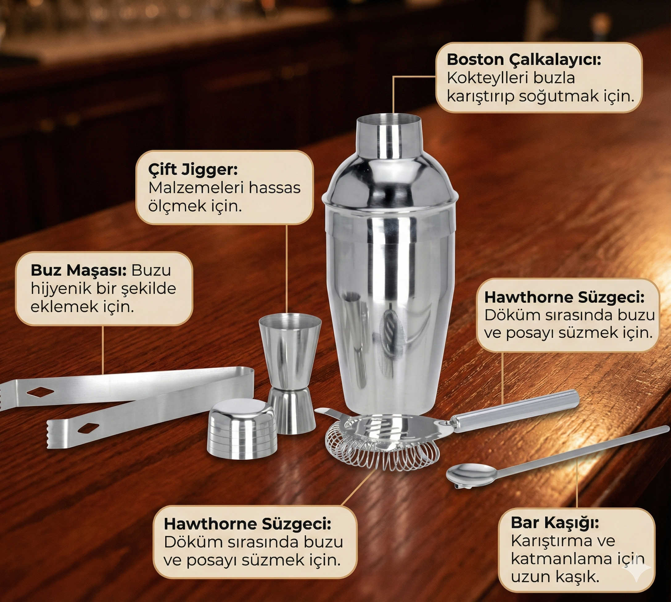 - Kokteyl seti tüm gerekli araçlara sahiptir,