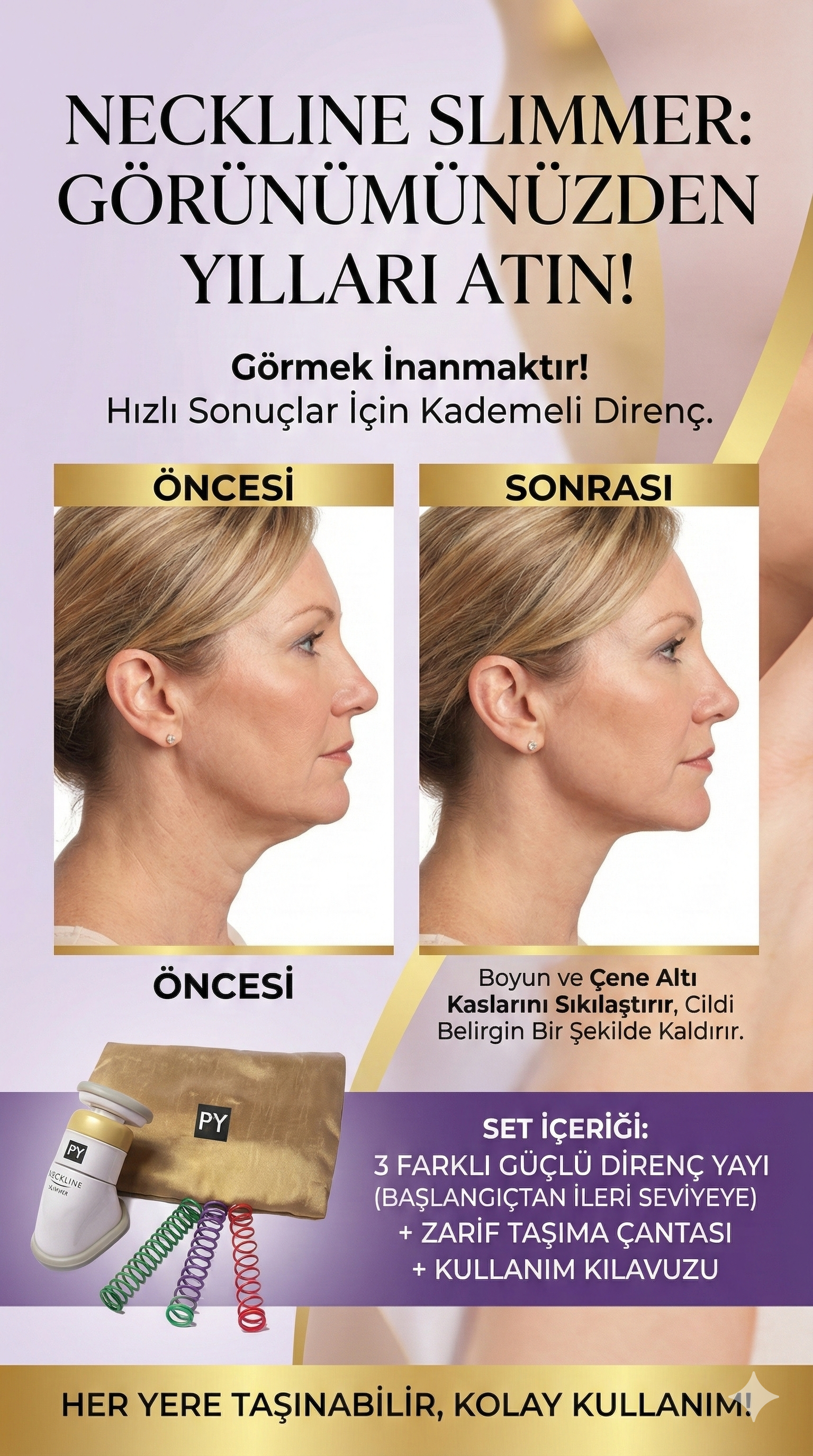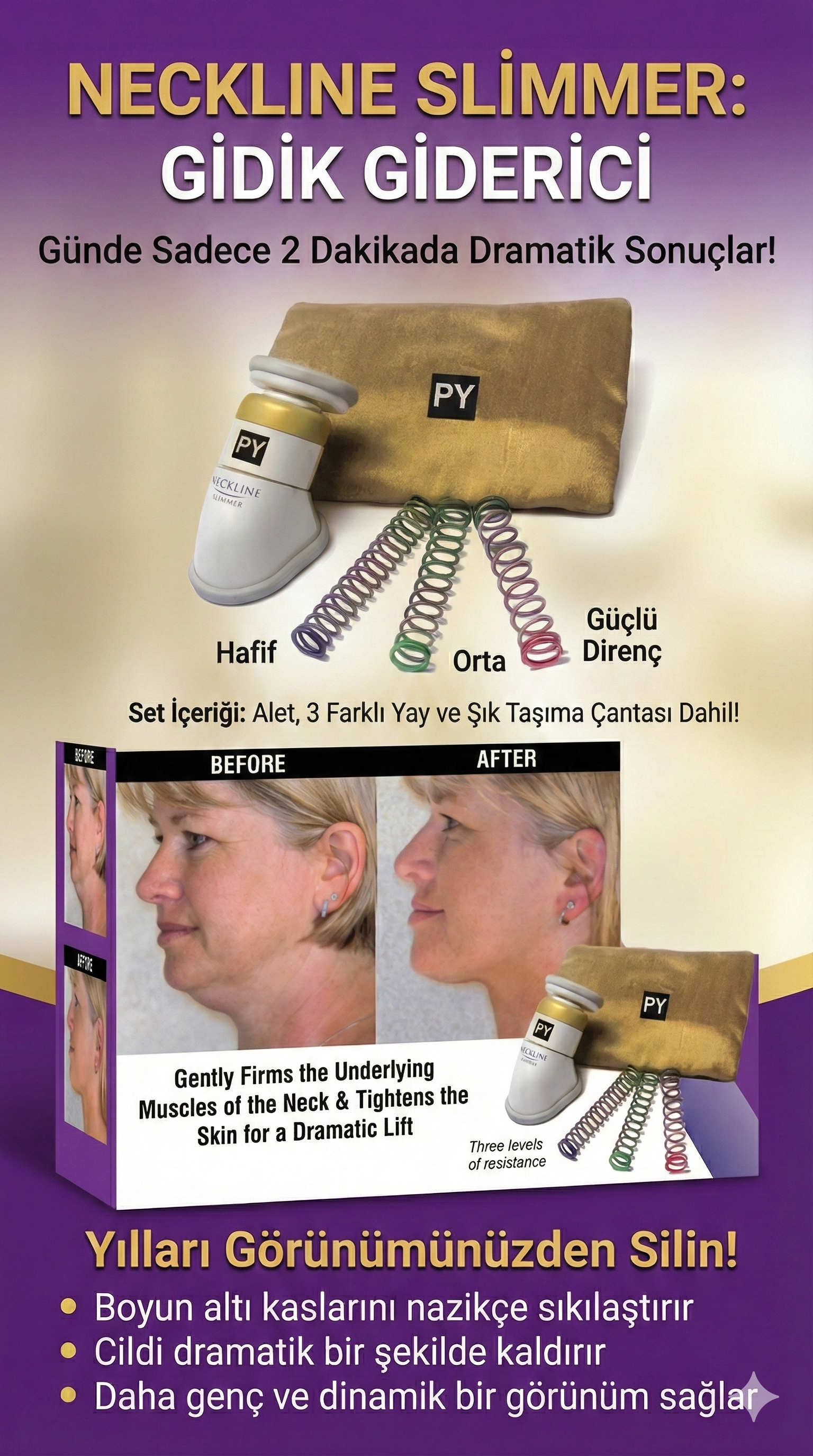Tamamen acısız ve ağrısız olarak zayıf çene altı kaslarının güçlendirilmesi ve yüz altı ile boyun gerginliğinin yeniden kazanımı için geliştirilmiş bir aparattır. Neckline Slimmer ile günlük 2 dakikalık masaj ve egzersiz sonunda çene altı, boyun kısmı ilk günkü tazeliğine ve sıkılığına kavuşacak. Paket içerisinden çıkmakta olan 3 farklı dirençte yay sistemi ile Neckline Slimmer güç ayarı değiştirleceği gibi uygulamanın ilerleyen günlerinde isteğe göre sertlik derecesi yükseltilebilmekte veya düşürülebilmektedir.İnsanların egzersiz hareketlerini kolaylıkla ve sıkılmadan yapabilmeleri için yepyeni bir egzersiz sistemi düzenlenerek Neckline Slimmer′ı geliştirmiştir. Neckline Slimmer, yüz, çene ve boyun kaslarında kalıtsal yahut zaman içerisinde oluşmuş fazla yağ birikimlerini çalıştırarak daha sıkı ve diri bir görünüm elde etmeyi sağlar. Boyun kasları da vücuttaki her kas gibi egzersize ihtiyaç duyar ve eğer düzenli egzersiz yapılırsa diğer kaslarımız gibi sonuç verir. Ürün Özellikleri: Neckline Slimmer ile yapılan egzersizlerde; Egzersizlerinizi eğlenceye dönüştürür, Zaman kaybı yok, Egzersiz programını uygulama zorluğu yok, Sağlığınıza yan etkisi yok, Yaş sınırı yok, Acı çekmek yok, Kullanımda zorluk çekmek yok, Morarma, şişme veya kızarıklık yok,