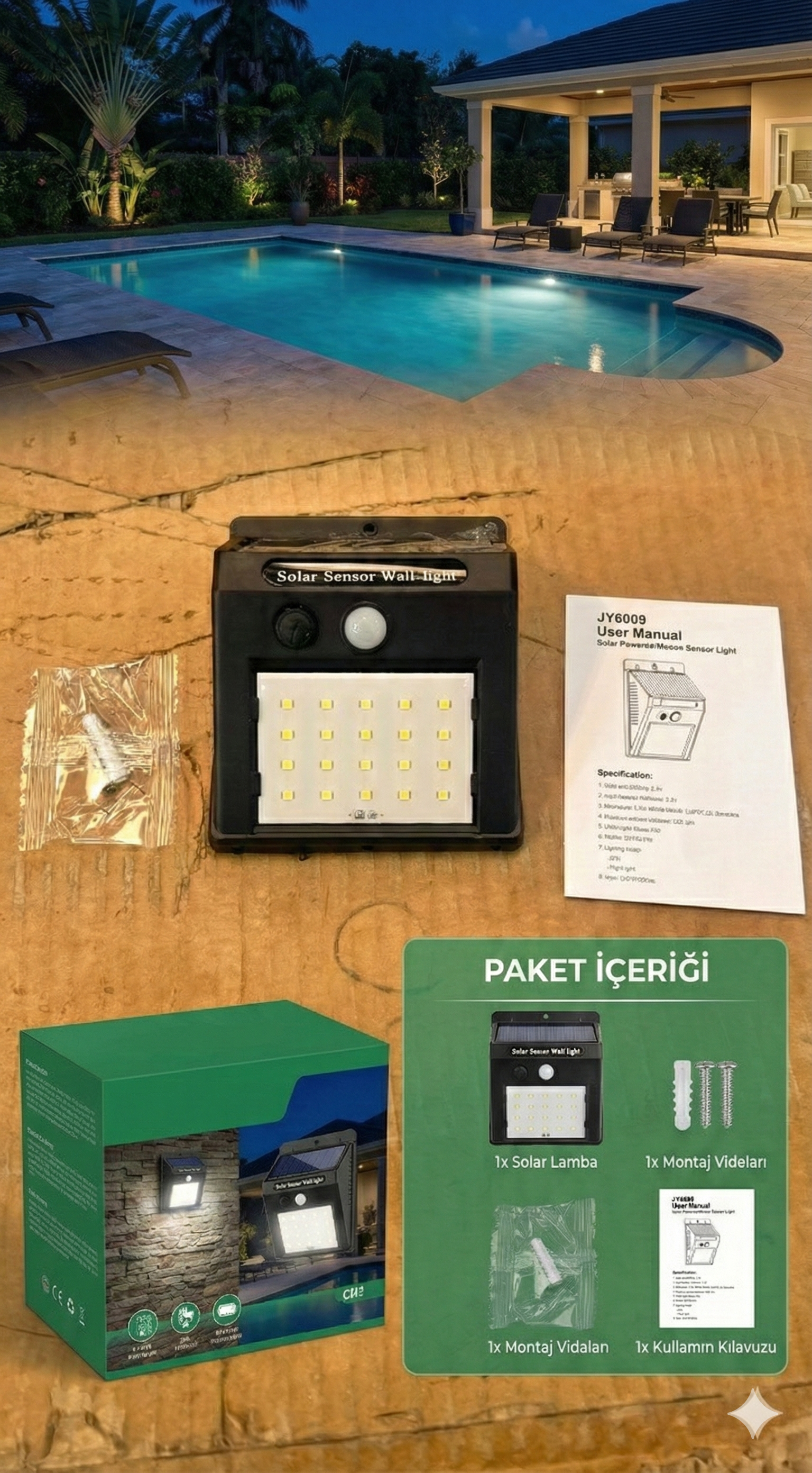 Paket İçeriği : 1 Adet Hareket Sensörlü Solar Dış Mekan Lambası