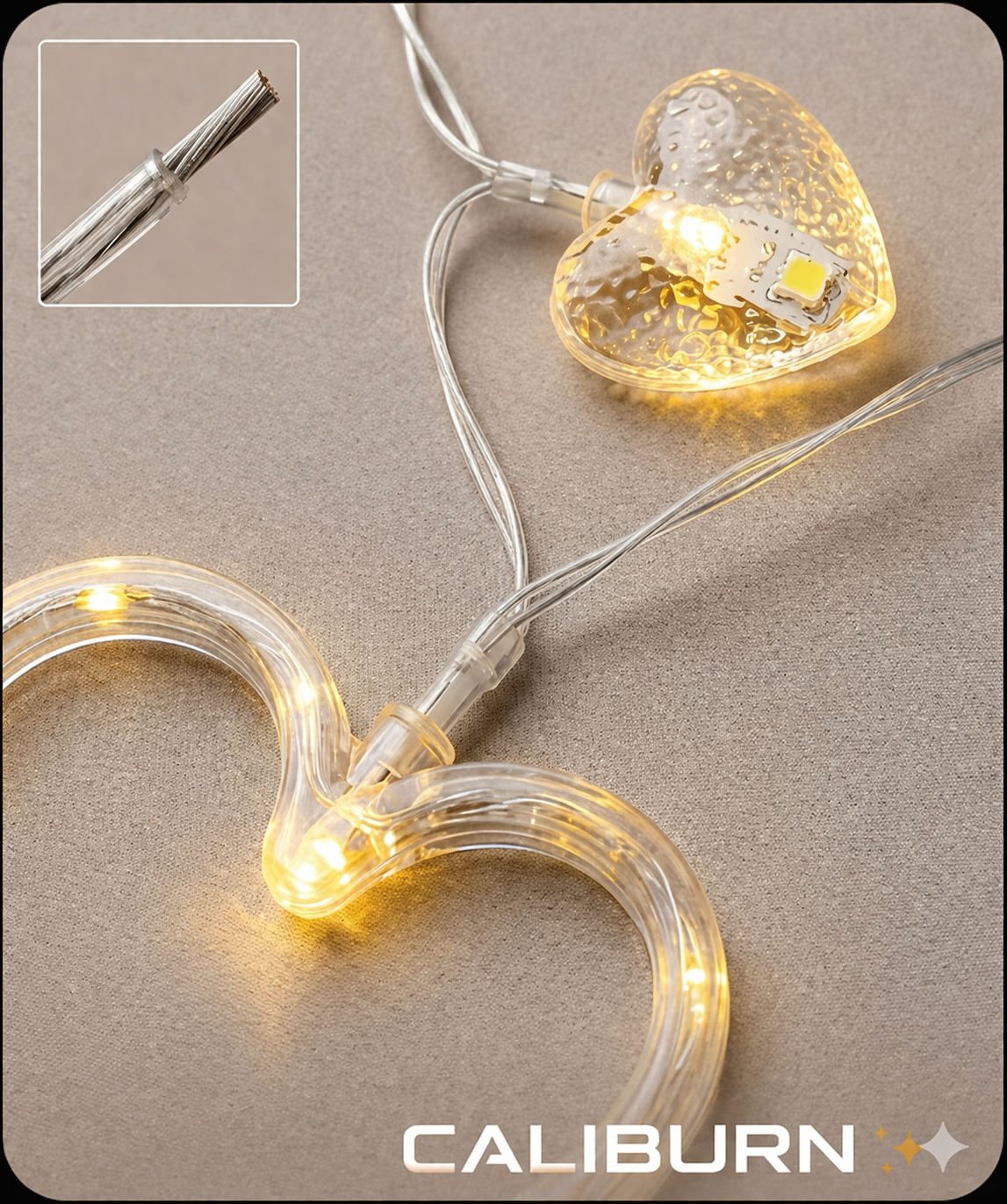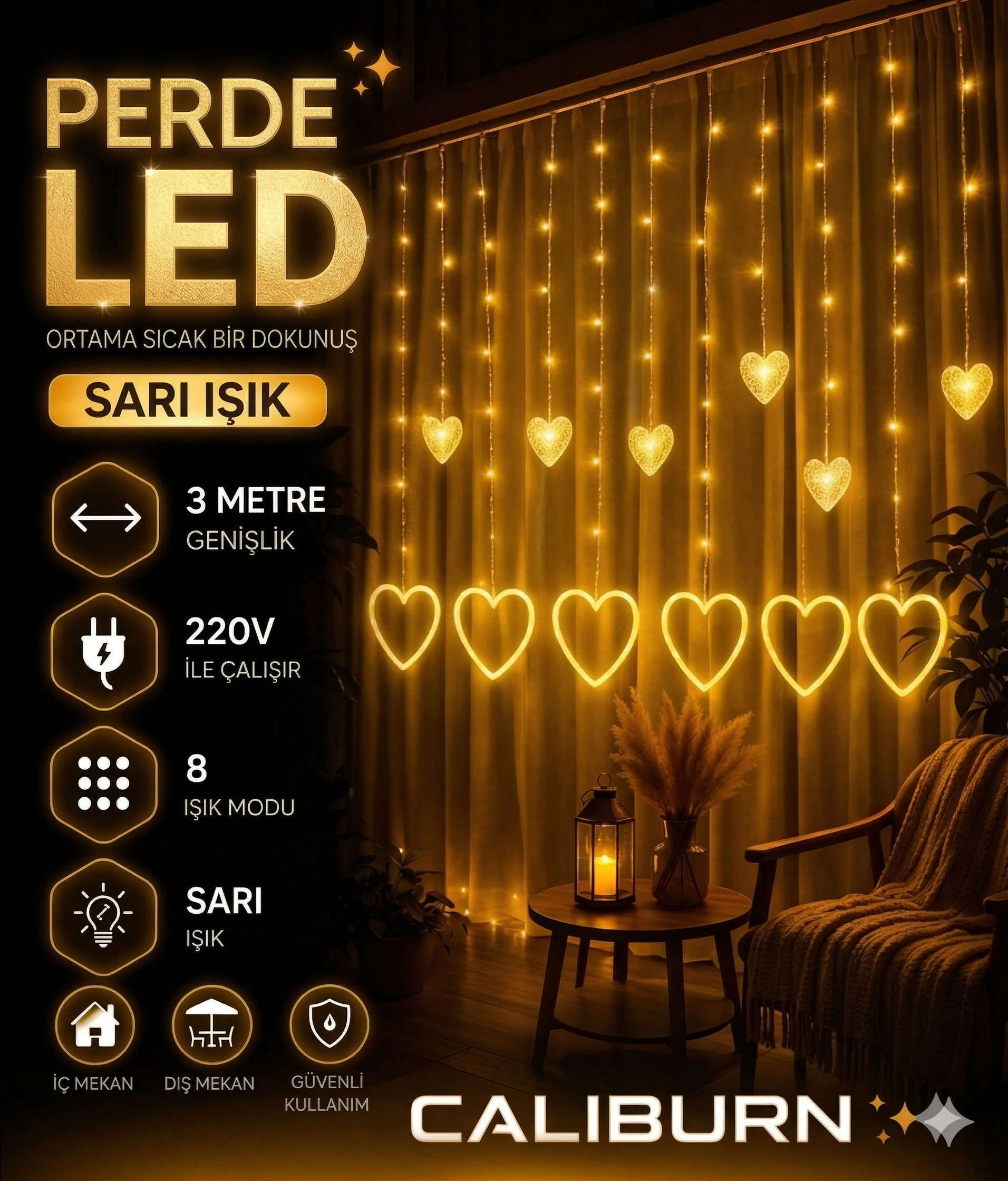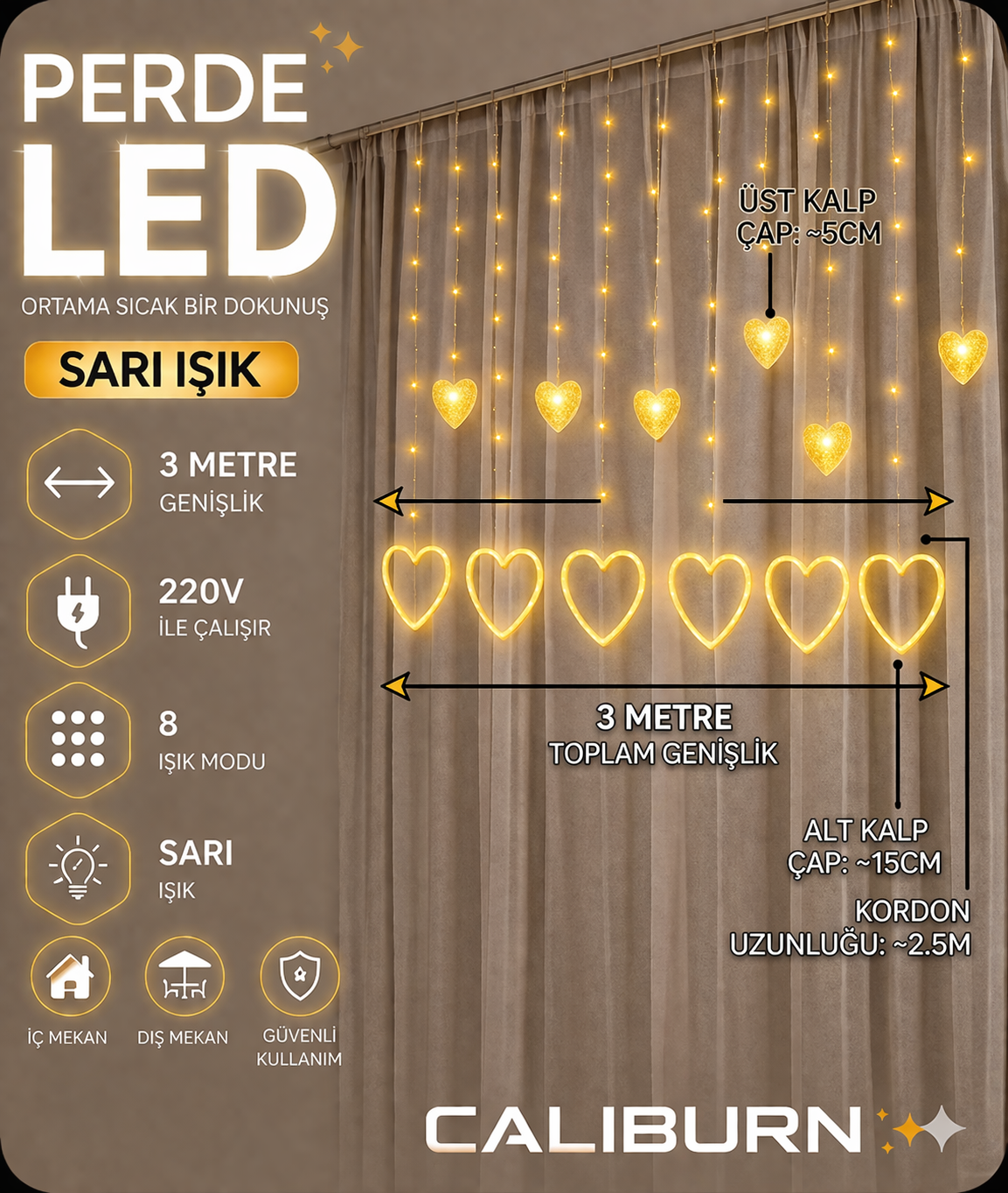 CALIBURN Kalp Şekilli Perde LED Işık Zinciri, yaşam alanlarınıza anında huzurlu, samimi ve şık bir atmosfer getirir. 3 metre genişliğiyle pencere önleri, yatak başlıkları veya duvar dekorasyonları için mükemmel bir seçimdir.