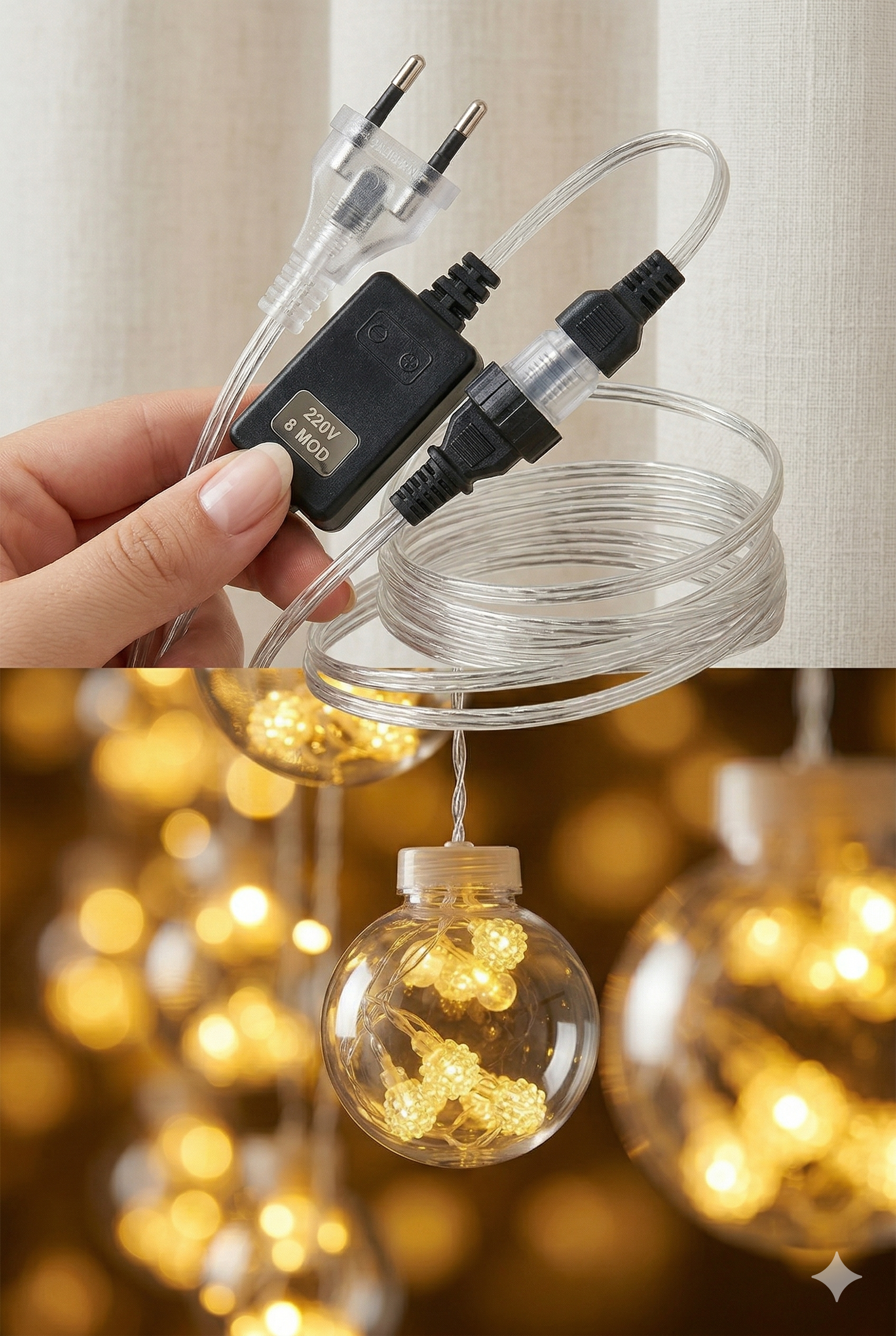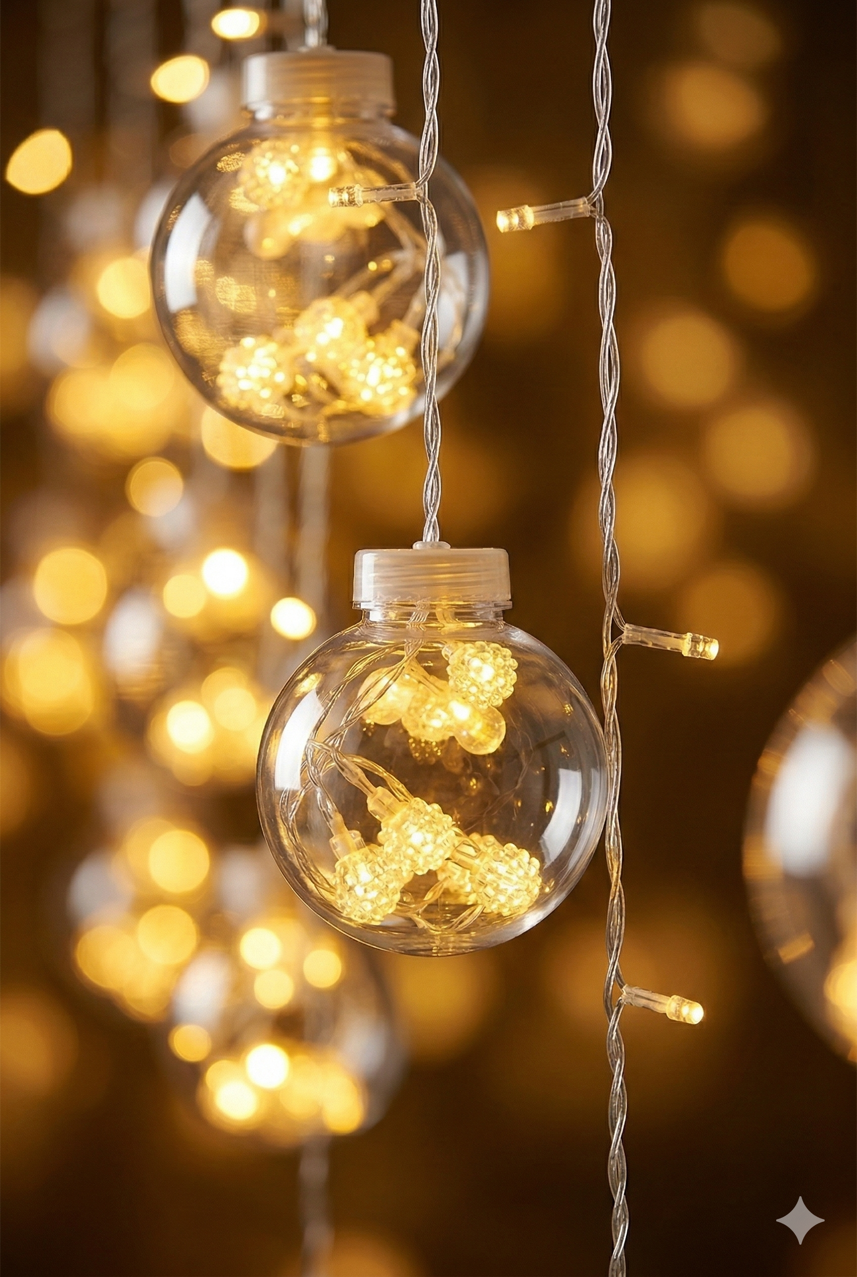 Premium Tasarım: 3 metre genişliğindeki şeffaf kablo üzerinde, içleri minik kristal LED’lerle dolu 10 adet dekoratif büyük top küre yer alır.