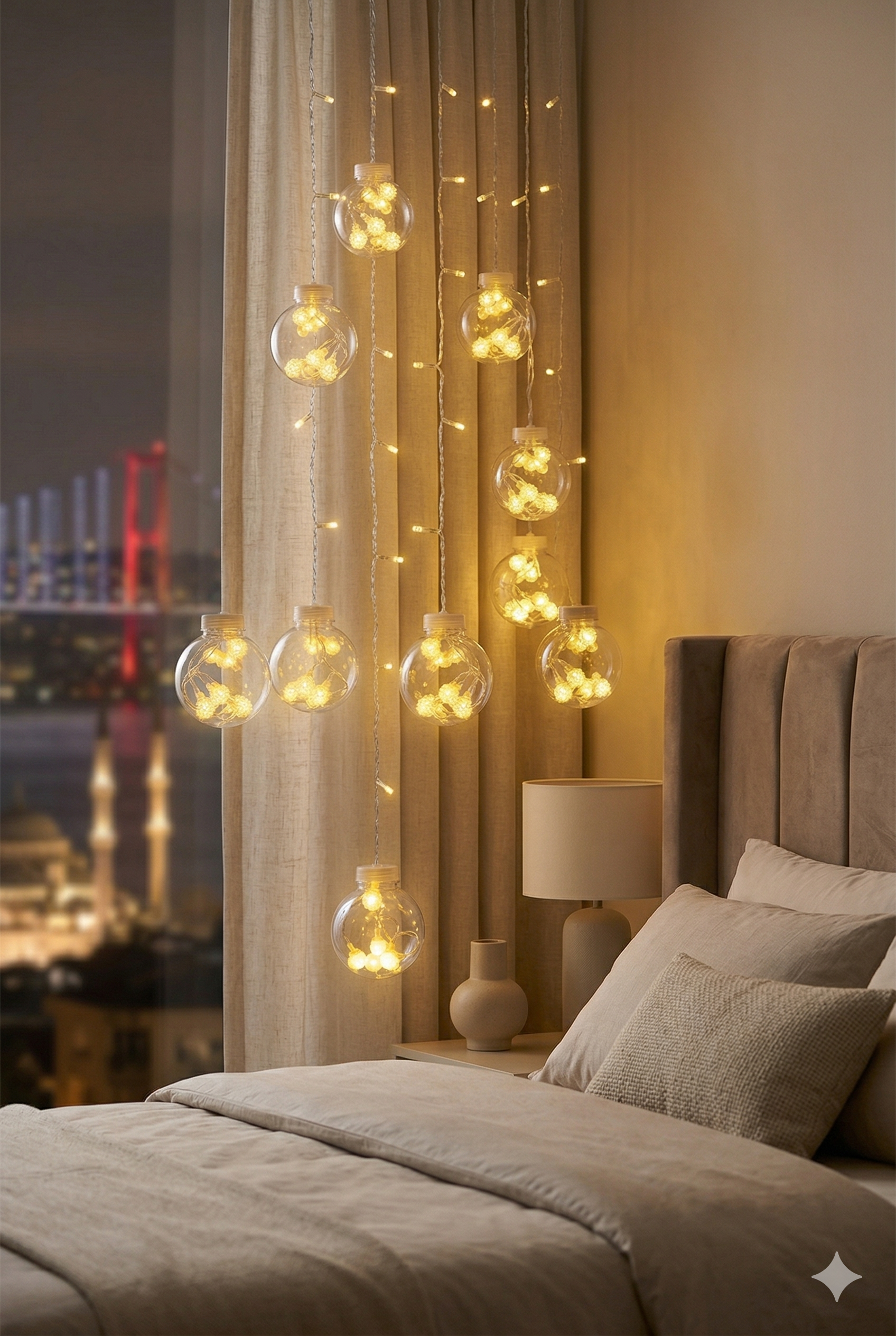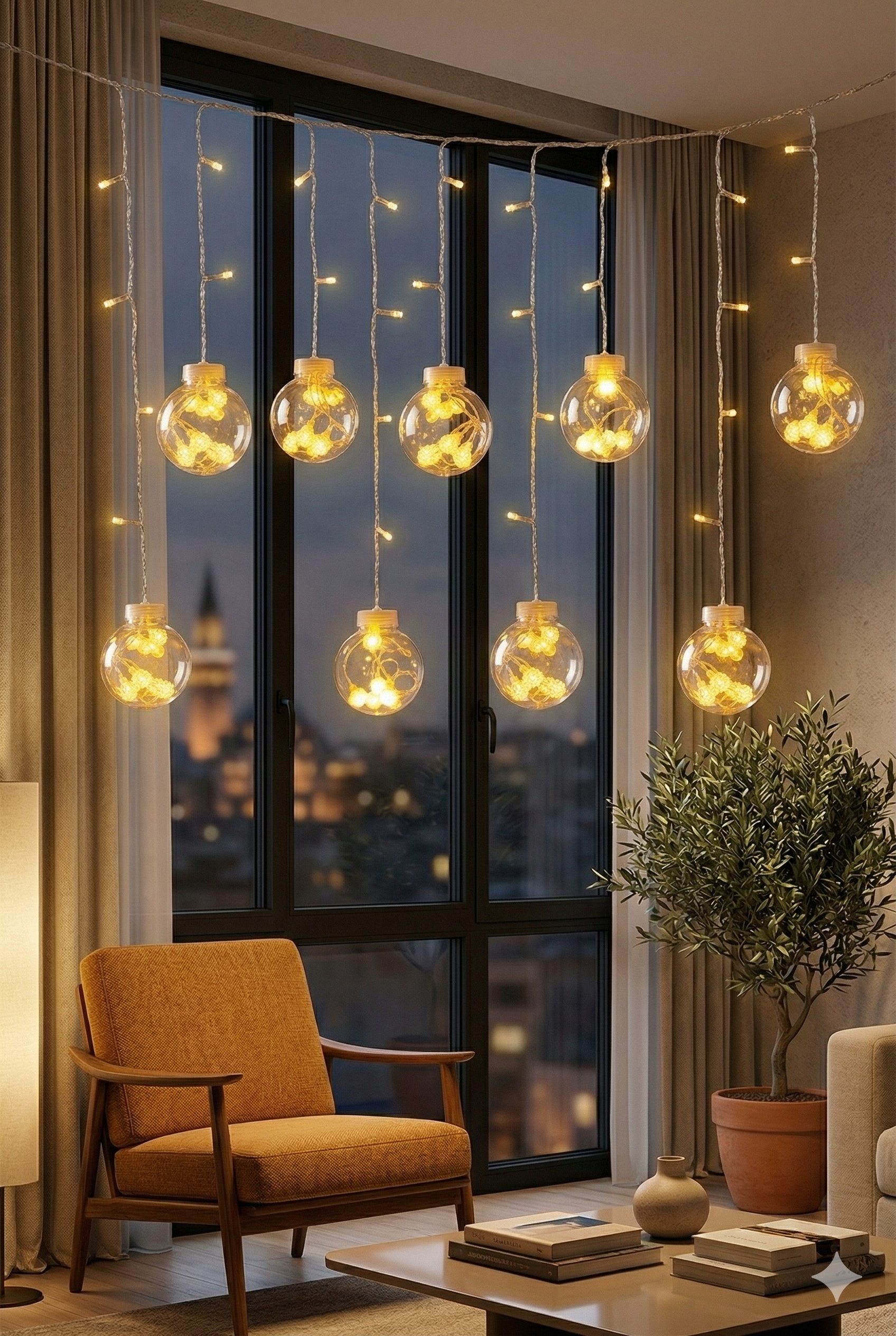 Pencere ve Perde Dekoru: Salonunuzda boydan boya şık bir ışık şelalesi oluşturun.