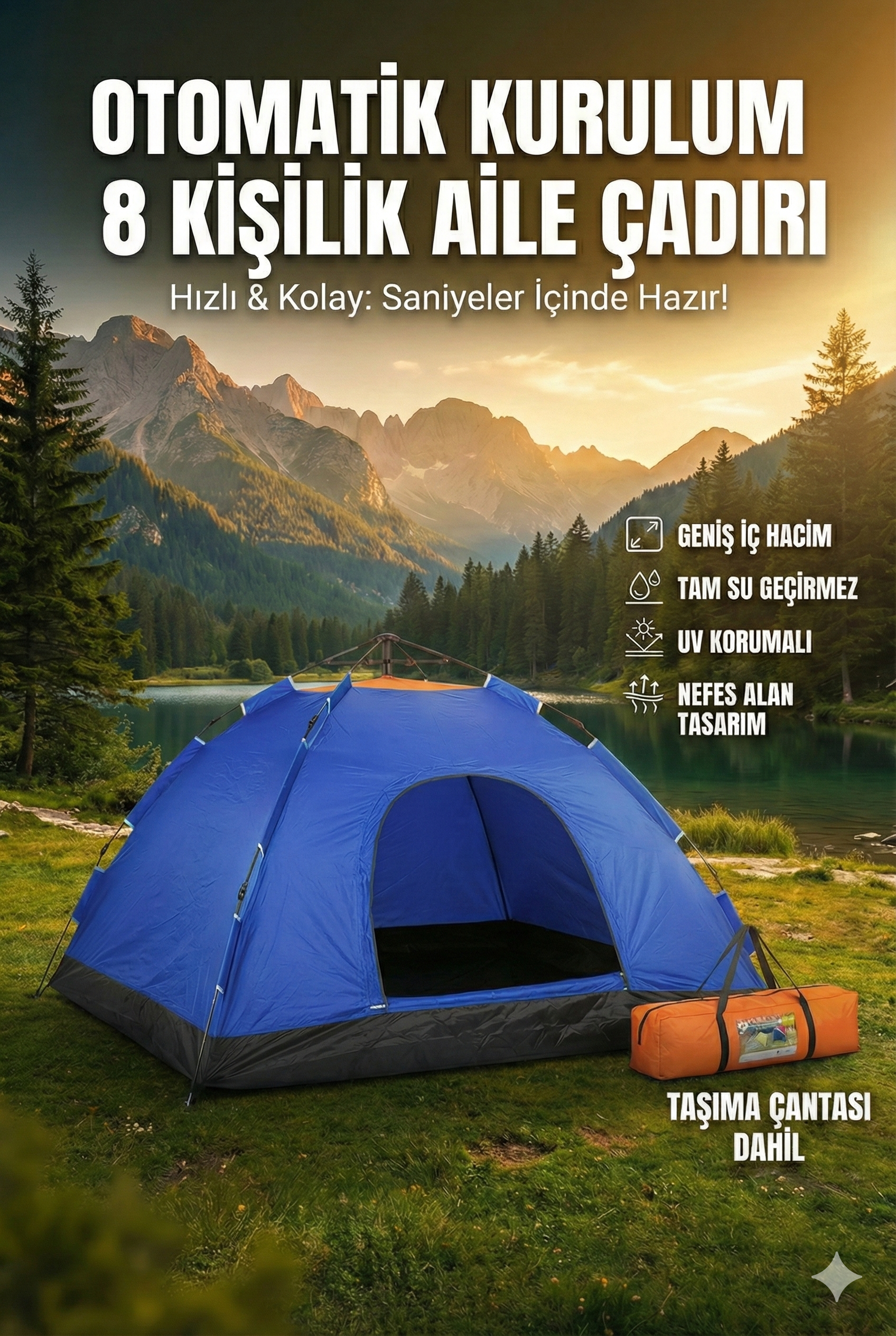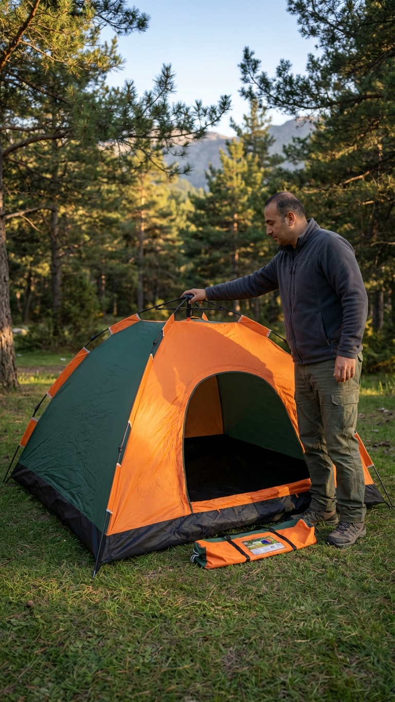 Yaz tatilinizi unutulmaz kılmak için tam da size göre bir fırsat. Tam Otomatik Kurulumlu Kamp Çadırı. Artık tatil anlayışınızı değiştirmenin tam zamanı. Her sene gittiğiniz yazlıklardan, sıkıcı pansiyonlardan veya pahalı ve monoton otellerden sıkıldıysanız, heyecan ve macera arıyorsanız kamp çadırı almanın zamanı gelmiş demektir. Kolay kurulumlu Kamp Çadırı yer kaplamaz ve pratiktir. Taşıma çantası sayesinde arabanızda bisikletiniz de veya sırt çantanızda rahatlıkla taşıyabilirsiniz. Yıllardır doğa tutkunlarının vazgeçilmezi olan otomatik kurulum kamp çadırı ayrıca avcılar, dağcılar, izciler ve gençlik festival takipçilerinin vazgeçilmezi olmuştur.